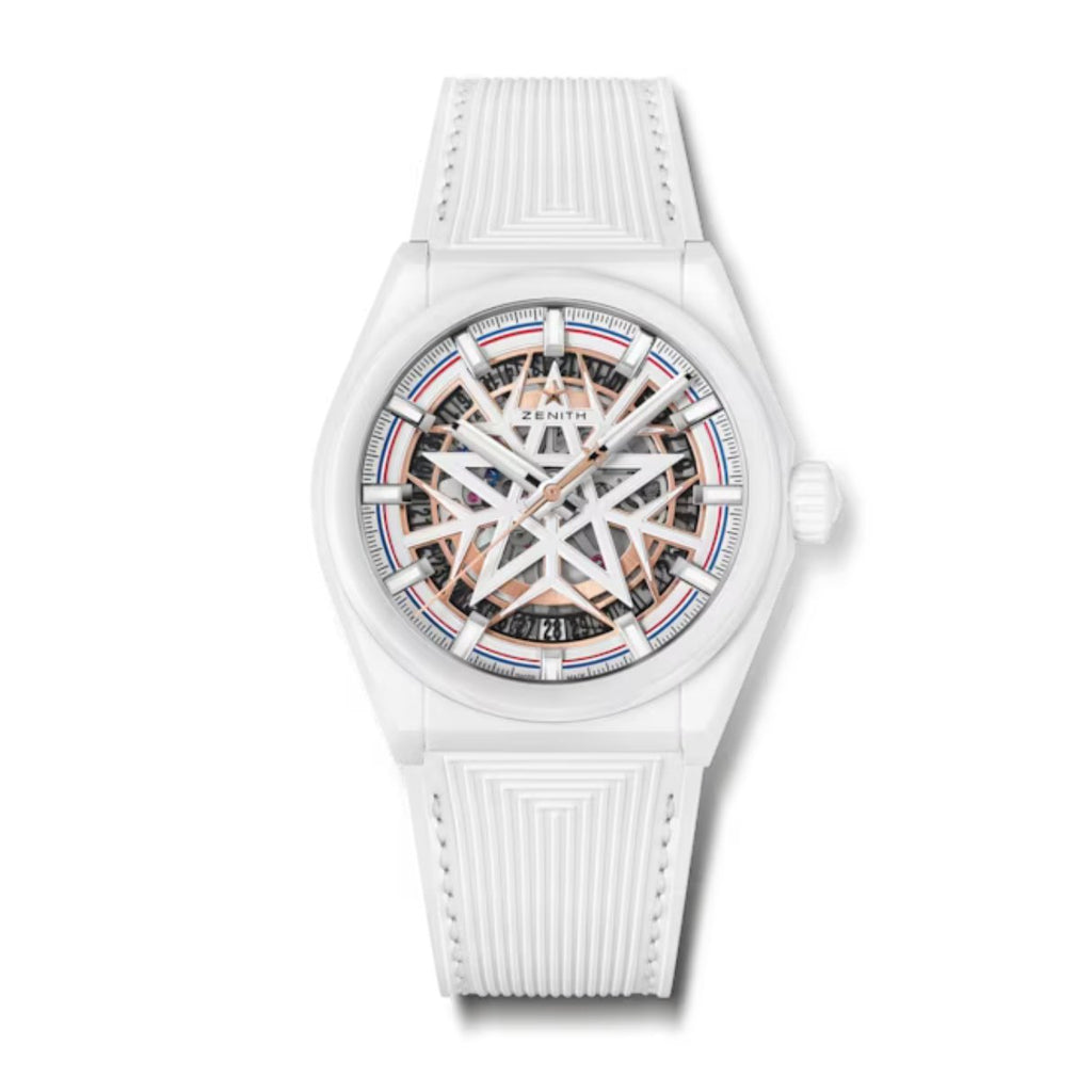 The DEFY Classic Fusalp limited edition is a skeleton watch designed in collaboration with French luxury ski clothing tailor Fusalp. Crafted in white ceramic, it features an open dial with a new design incorporating the ZENITH five-pointed star and Fusalp snowflake emblems. Powered by the Elite automatic manufacture movement. Fitted on a rubber strap designed by Fusalp with a fabric-like texture and concentric rectangles.