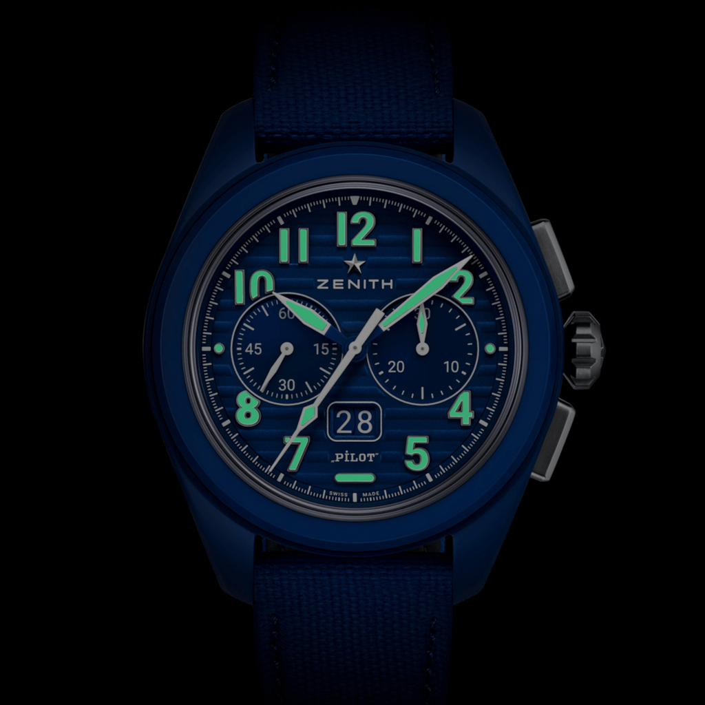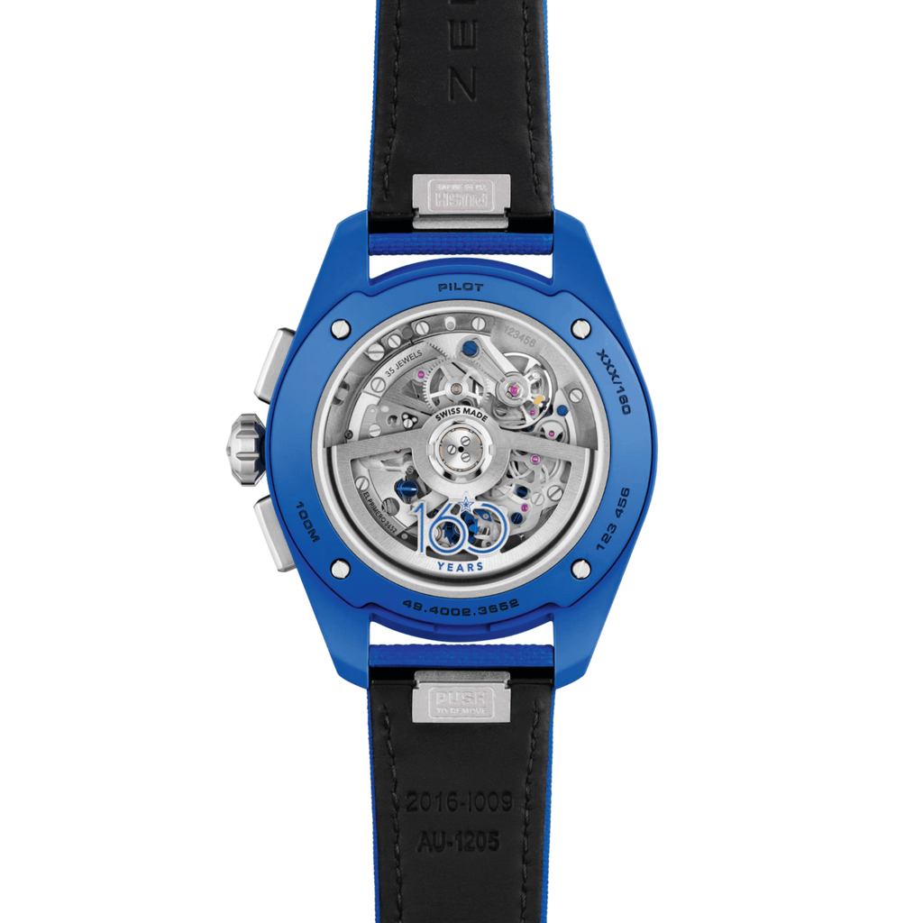 The ZENITH aviator's chronograph in a monochrome blue version. Crafted in a 42.5mm blue ceramic case with a titanium crown and titanium push-pieces, paired with a blue corrugated dial featuring large luminescent Arabic numerals. Powered by the El Primero 3652 automatic high-frequency chronograph calibre with big date and flyback functions. Delivered with both a blue and a white cordura effect rubber strap that can easily be swapped thanks to a smart strap changing system. Exclusive limited edition of 160 pieces for the 160th Anniversary of the Brand.